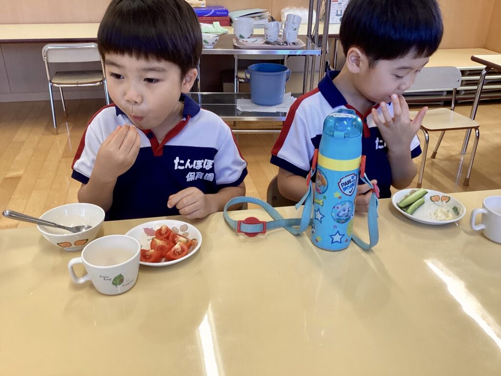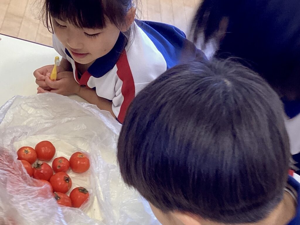 給食さんにカットしてもらい、おやつに ”山盛りトマト”をみんなでパクリ!