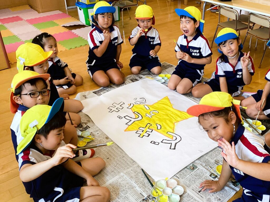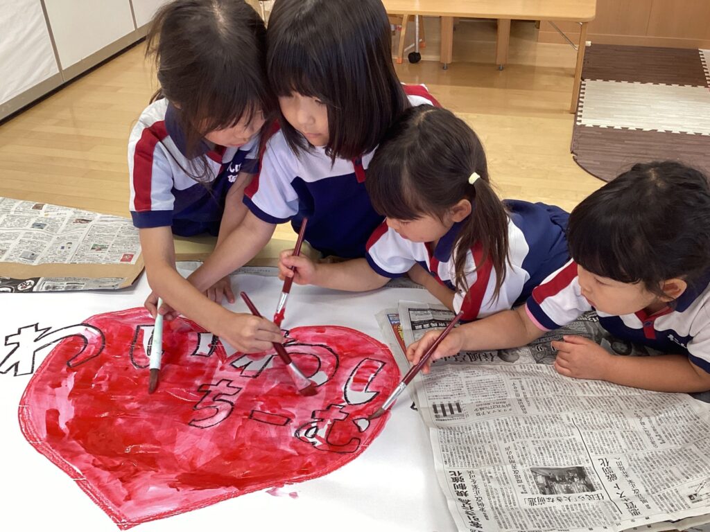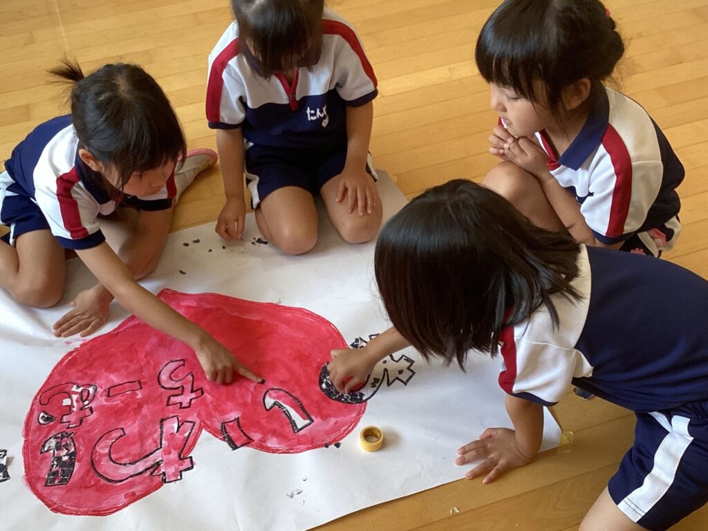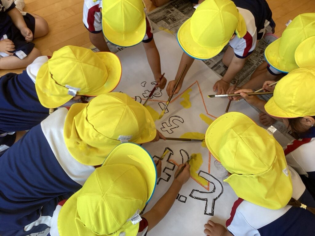 保育者たちは色からイメージして提案したつもりだったのですが、団旗を作り終えたあたりで、主役である子どもたちから「どきどき(胸の前でハートを作ってどきどきさせながら)なのに、なんでハートじゃないの?」と、大まじめな意見。