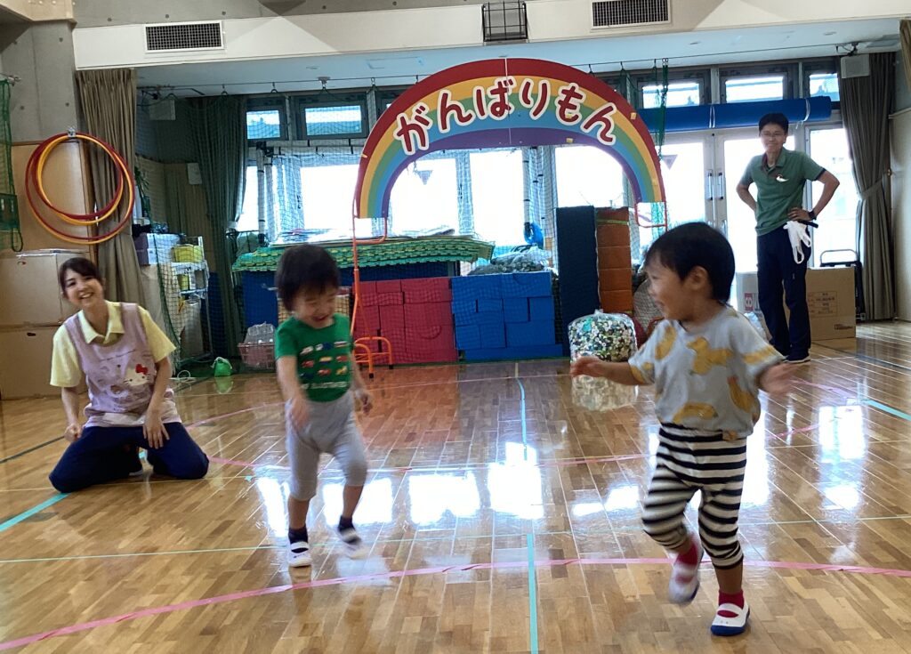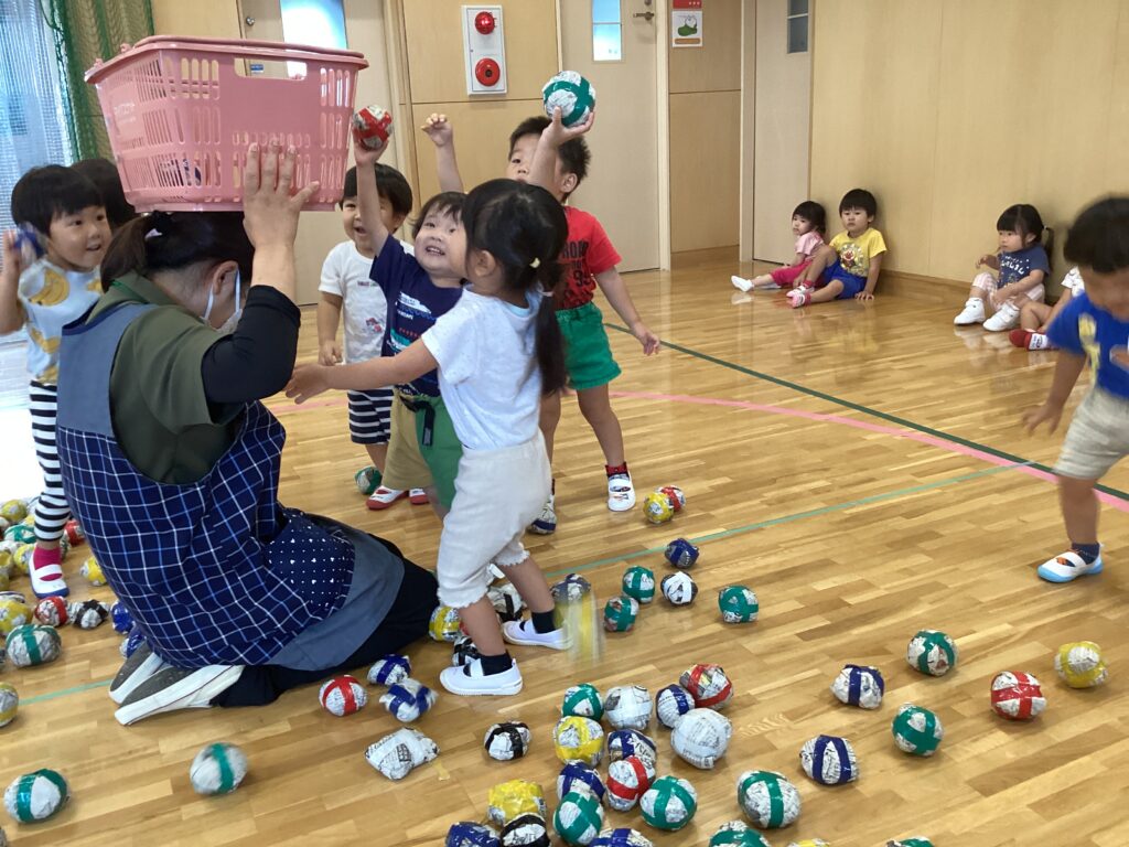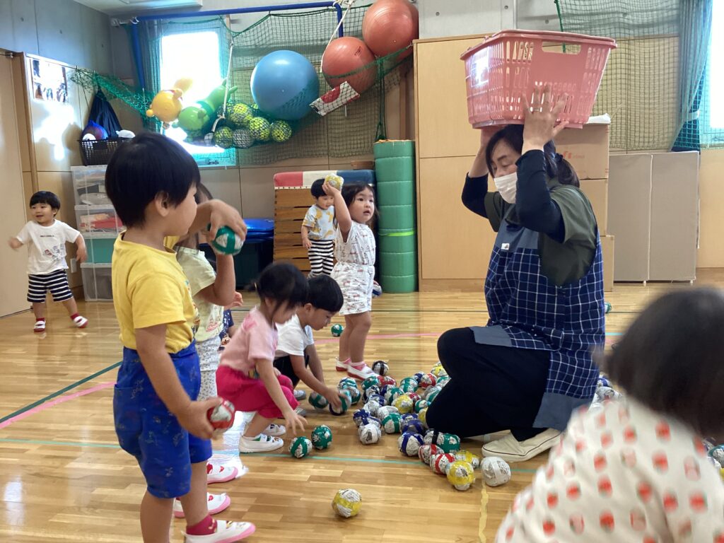 本番できらきらは行わないのですが、玉入れでも遊んでいます。どきどき、わいわいに分かれてお互いを応援し合い楽しみました。離れたところから投げていたのですが段々と近くに寄って行き、結果は接戦。また遊びましょうね。