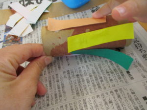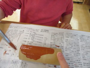 みのむしの身体を絵の具で塗りましたが、色を混ぜ合わせているのを見て「なにやってるのー?」ときらきらした表情で嬉しそうに教えてくれました。
