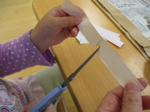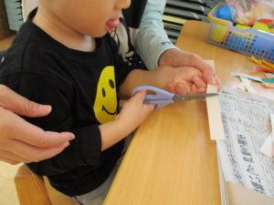 それでもハサミは初めて取り組んだこともあって、紙を持つときはどこを持つのか、切るときにはどのように力を入れるのか、保育士の顔を時折不安そうに見ながら取り組んでいました。