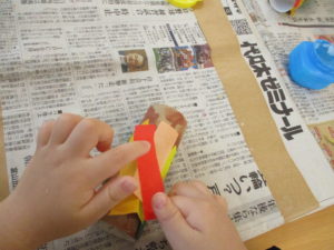 絵の具を塗ったり、折り紙をハサミで切ったり、作業工程が多い中でも集中して取り組む姿が見られており、成長を感じました。