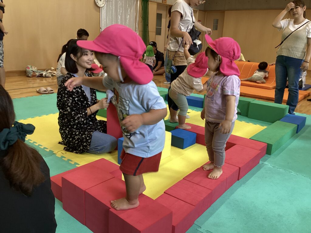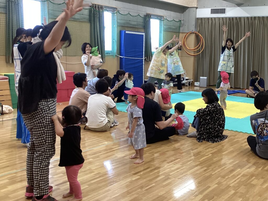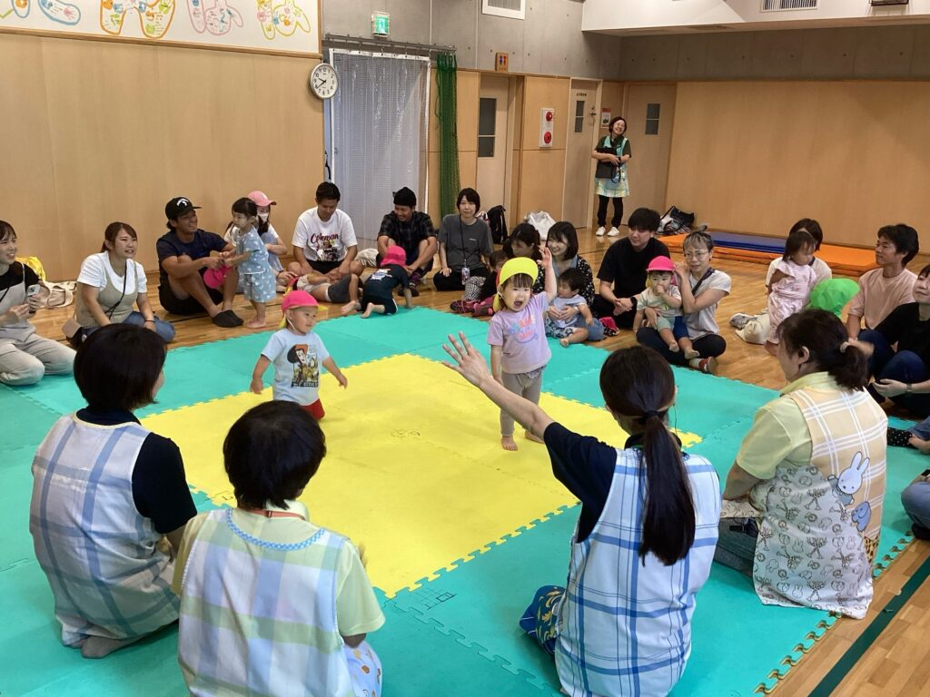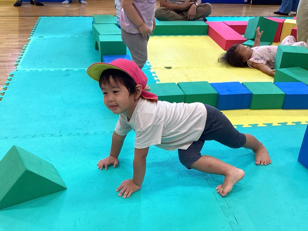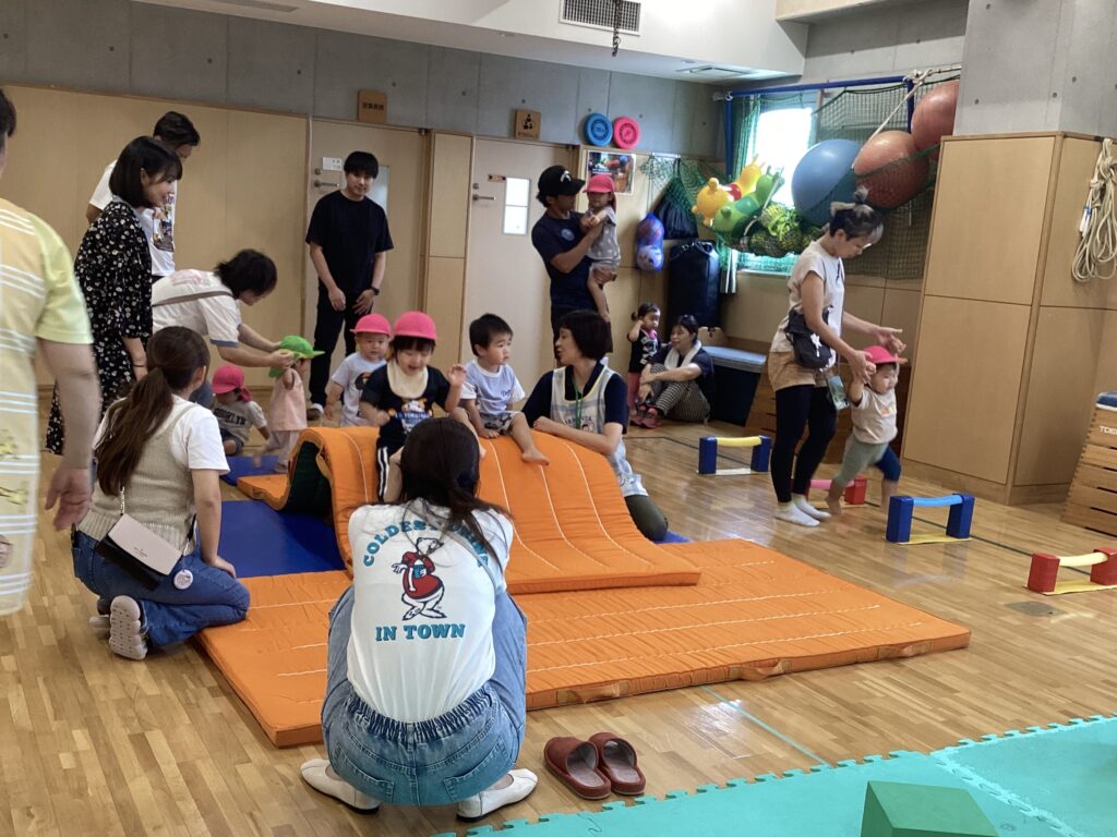 いつもホールで遊んでいる様子を、おうちの方に見てもらい、一緒に遊んで過ごしました。普段と違う雰囲気に緊張気味のお友だちでしたが、次第に緊張もほぐれて楽しんで身体を動かして遊ぶことができて嬉しそうでした。