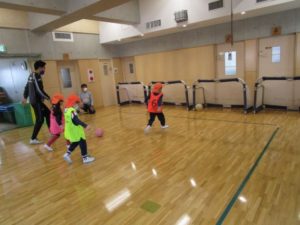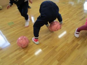 前回は手を使ってボールと触れ合っていた子が多かったのですが、