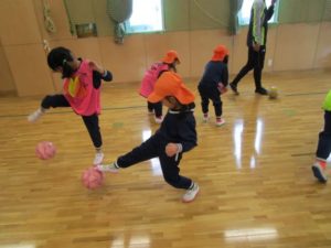 投げたボールを足で止めたり、自分の足からボールが離れないようにドリブル練習をしました。