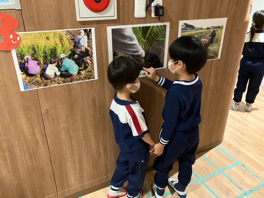 まずはおにぎりを作る前に、AB組さんでペアになり、「お米ってこうやってできるんだよ」と、来年A組になるB組さんへ伝授タイム。