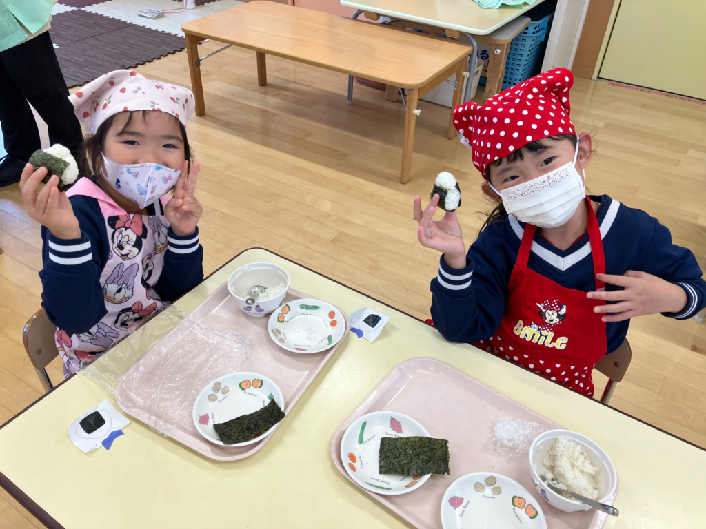 次はいよいよ【おにぎりづくり】!炊き立てのいい香りがするお米を目の前に、「お腹すいた・・早く食べたいな・・」と心の声をこぼしながら、みんなで楽しくおにぎりを握りました。▲の握り方は、先週から練習していたのでバッチリ!