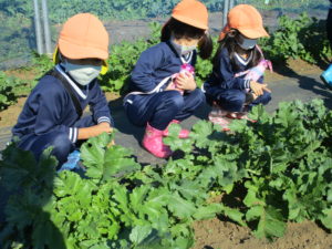 ▼さつまいもの収穫前に、大根元気にしてるかな~と覗くみんな。