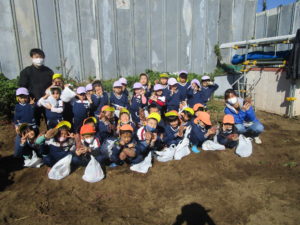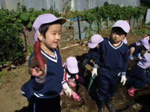 自分のさつまいもを大切に抱えて園まで持ち帰るみんなの姿も