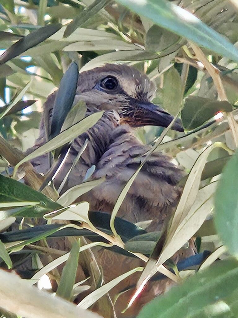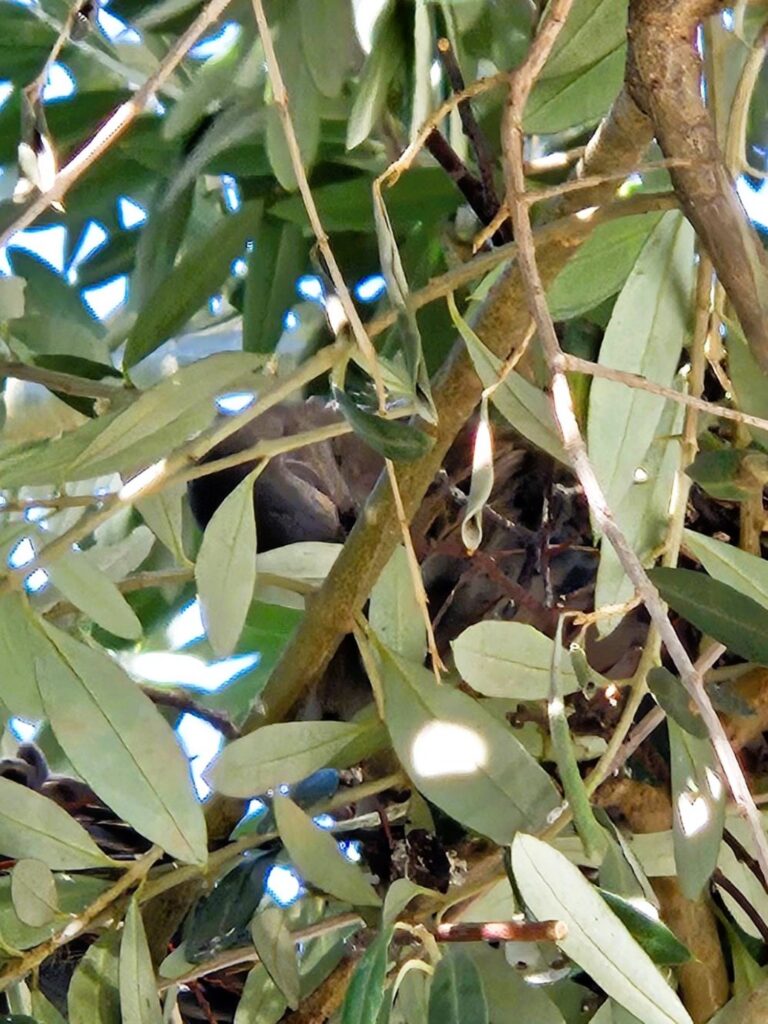 この数日、「あれ?なんか場所動いてる?」と思ったら、どうやら巣から出て、オリーブの樹の中を、ふたりでぴょこぴょこ移動しているようです。
