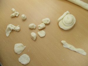 「ヘビつくったよ」「○○ちゃんはアンパンマンつくったの」と