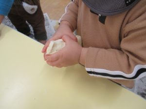 0歳児さんはにぎにぎしたり、ちぎったり、粘土の感触を味わっていました。