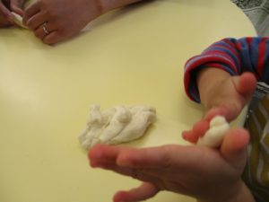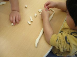 1歳児さんはすぐに伸ばし、はじめはお決まりの『へび』作り!