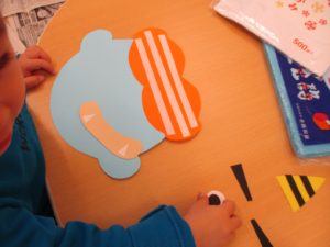 【鬼のお面】は、目・口・眉毛・角 のパーツを顔型の台紙に貼っていきます。