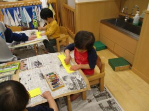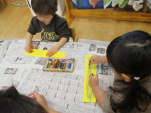 まずは【豆入れ】黄色い画用紙にクレヨンでお絵かきをしました。