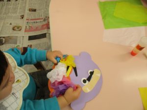 鬼のもじゃもじゃ髪の毛は、花紙を丸めて貼りました。