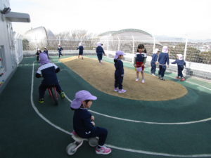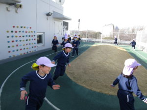 屋上に移動すると「さむーい!」と話す子ども達、準備運動も兼ねてみんなでマラソンを行いました。