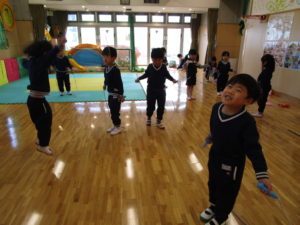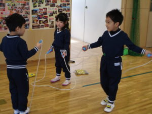 今日はホールで縄跳びを使って遊びました。