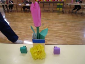 机にはB組さんが作ってくれた席札とチューリップのお花。