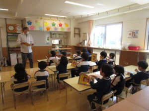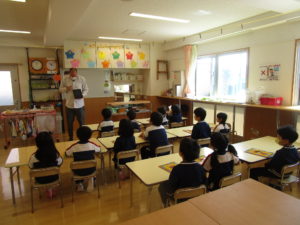 他にはAから始まる単語や鉛筆・消しゴムなどの単語、「立つ」「座る」「本を開く」「本を閉じる」などの動作の言い方も教えてくれました!子ども達が答えられるものもいくつかありトム先生に褒めてもらうたびに恥ずかしそうにしながらも自信がついたようで元気に答えられるようになってきました!