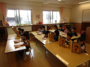 A組になって1週間が経ち、子ども達も少しずつ実感がわいてきています。4月の壁面の糊付けも頑張ったその後は、、、。
