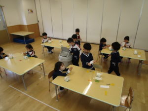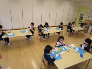 最初のこいのぼり製作では、土台となる紙を直線で、目玉になる紙は丸型に切りました。