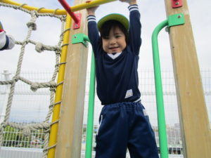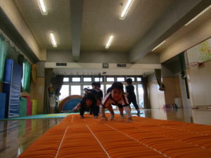 しゃがんだ姿勢から両手を前につき、そこまで両足ジャンプの「ウサギジャンプ」など行いました。お家でもできる内容なので、練習やコミュニケーションの一つとしてやってみてくださいネ。