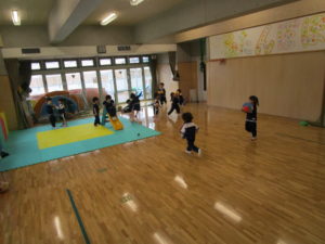 ホール遊びでは、マットを使って腕の力をつけるため、「ハイハイ」や 四つん這いで手と足(膝は着けない)「ライオン歩き」、