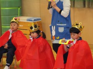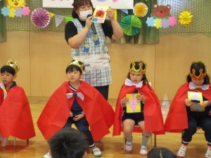 おやつを食べた後、4・5月生まれのお友達の誕生日会をホールで行いました。