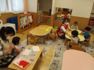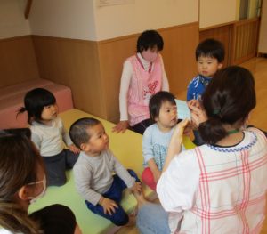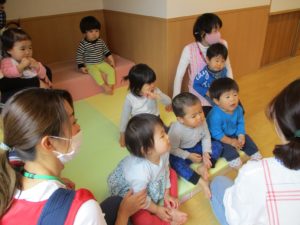 続いて、これから行う『シール貼り』と『手形』の説明を聞くお友だち。