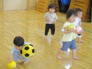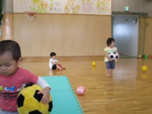 1歳児さんは、ホールでボールを使って遊びました。ボールを投げるというよりは、持って走るお友だち。