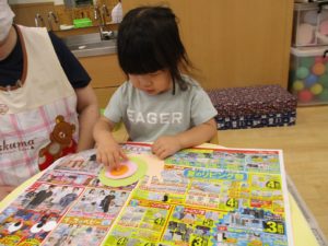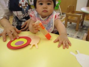 0歳児さんは糊付けした画用紙のベタベタ感に手を引っ込めたり、眉間にしわを寄せていました。