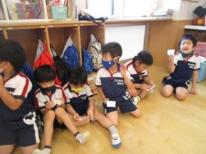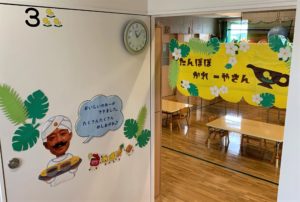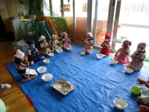 保育室でエプロン三角巾をつけていざ、ホールへ!