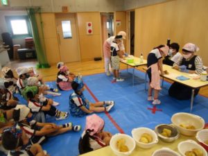 A組さんには包丁を握ってじゃがいもを切ってもらいました。