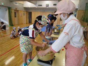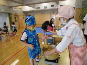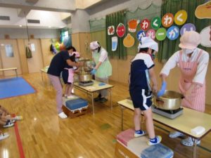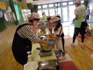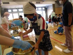 クラスごと2人ずつ前にでてきて、しゃもじを使って、食材をよく混ぜ合わせながら炒めていきました。