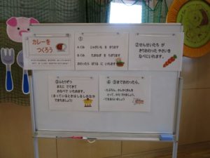朝のご挨拶をして説明をよく聞いて消毒をしたらカレー作りの始まりです。