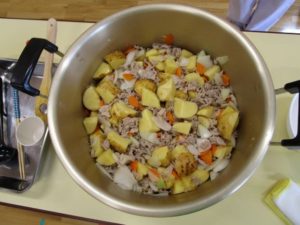 ぶたにく、玉ねぎ、にんじん、じゃがいもの順番に鍋にいれて炒め作業!