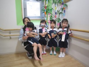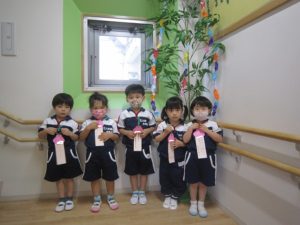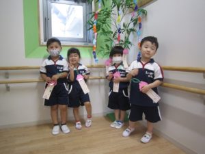 朝の会で、「今日は短冊を飾るよ!」と声をかけると、「〇〇になりたい!〇〇って書いたんだよ!」などと、お家で考えてきたお願い事を、それぞれ嬉しそうに教えてくれましたよ。
