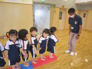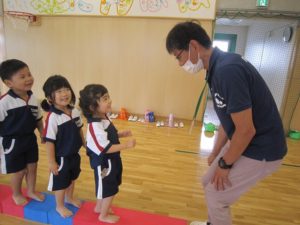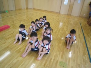 しっかりと体操座りで座り、遊ぶ前のお約束事を聞いている子ども達!