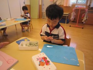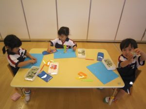 今日は、室内でお絵描き遊びと粘土遊びを行いました。
