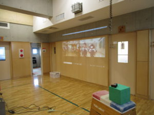 ▼ホールに集まって準備をします。みんな壁に映った映像に興味津々!