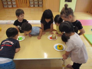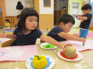 レンコンを見て子ども達が話していた「あなのあいただよ」には保育士も思わず笑ってしまいました。パプリカは歌も有名になってきたことで、見つけた瞬間に答えていました!流石ですね!オクラは子ども達も悩んでいましたが、悩んだ結果答えにたどり着いた子がいて、名前を聞いたらみんな思い出した様子でした!