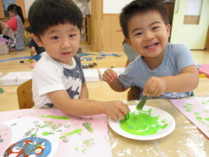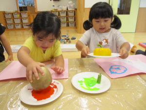 「もっとやるー!もっとー!」と子ども達は野菜スタンプをとても楽しんでくれて、最後はお化けが見えなくなってしまうほど素敵な作品が出来上がりました!中でもオクラは「せんせいおほしさまみたーい!」と何度も楽しそうに押す姿が見られていました!