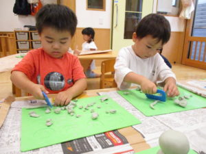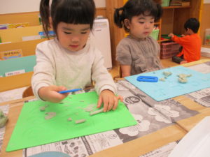 今日はおままごと遊びのように細長くした粘土を細かく切って遊んでいました。