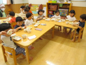 子ども達は自分で食べられるもの、残したいものを保育士に伝えながら、