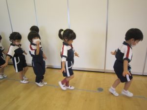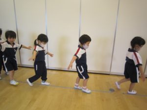 最近は、床に貼られてあるテープを平均台に見立てて、バランス歩き・カニさん歩き・くまさん歩きの練習をしました!