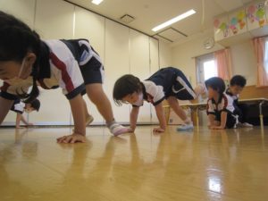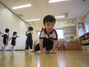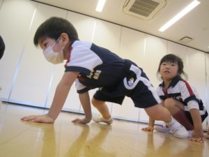 くまさん歩きでは、両手を地面につけてお尻を高く上げてくまさんに見立てて歩きましたよ。