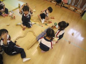 運動遊びを楽しんだ後は、大好きなお人形と機関車トーマスの玩具を出して遊びました!