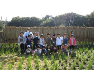 みんなで協力して、ゆう先生がいる場所まで、稲を運びました。