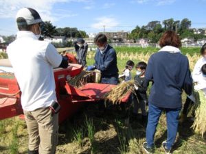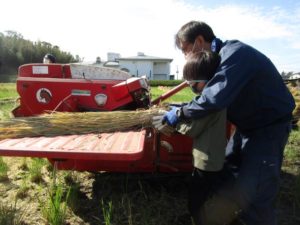 一人ずつゆう先生と一緒に稲を脱穀機に入れる作業も体験しました。